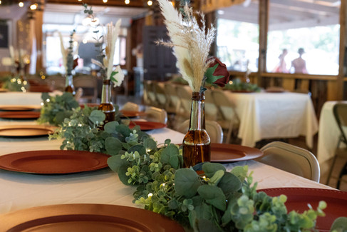 Outdoor Chapel: Church seating overlooks the lake and dock where your ceremony takes place. Your guest will be shaded under the completed chapel with a full functioning bell tower. Included are 18 antique wood church pews. Additional seating alongside the chapel is provided.